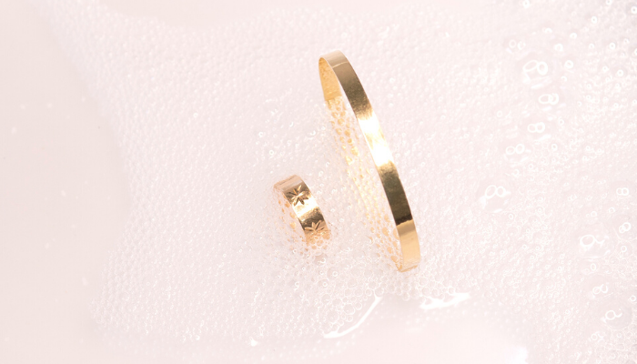 - Give your solid gold bracelets, chains, rings and earrings a gentle bath by soaking them in warm water with a few drops of detergent soap or dishwashing liquid.