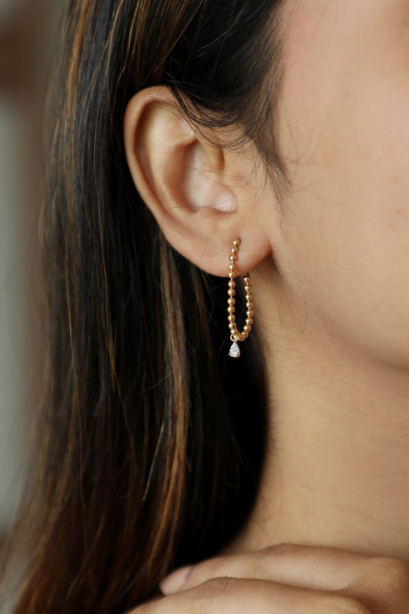 A delicate blend of texture and shine, this gold ball chain earring is finished with natural diamonds that catch the light with every move. Minimal, modern, and made to wear every day.