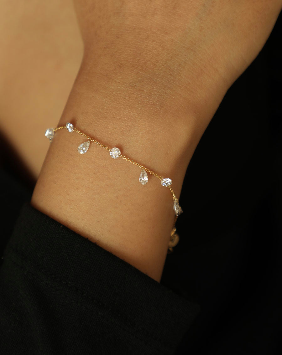 Diamonds that dance with every movement! Our Dangling Diamond Bracelet features delicate diamonds suspended from a 14kt gold chainCreating beautiful movement and sparkle. Perfect for adding that touch of luxury to your everyday look.