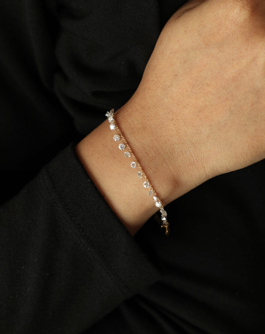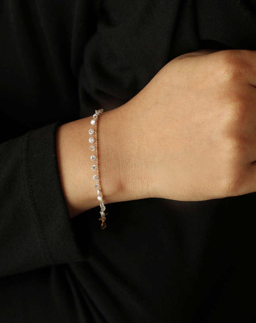Scattered round lab grown diamonds set on a delicate 14kt gold chain creates this everyday luxury piece. Each diamond catches the light beautifully as you move through your day, making this bracelet perfect for stacking or wearing solo.